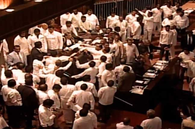 (பாராளுமன்றத்தில் பதற்றநிலை – சபாநாயகரின் ஆசனத்தை சூழ்ந்து கொண்டு கூச்சல்)