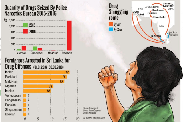 2016 ஆண்டு இலங்கையில் போதைப் பொருட்கள் சம்பந்தமான குற்றச் செயல்களுக்காக கைது செய்யப்பட்டவர்களின் எண்ணிக்கை 79,378 ஆவதோடு, இவர்களில் 35% வீதம் ஹெரோயீனை வைத்திருந்ததற்காகவும், 60% வீதமானோர் கஞ்சா தொடர்பான குற்றங்களுக்காகவும் கைது செய்யப்பட்டனர். மேலும் பெரும்பான்மைக் குற்றச் செயல்கள் மேல் மாகாணத்தில் (60%) பதிவாகியது.