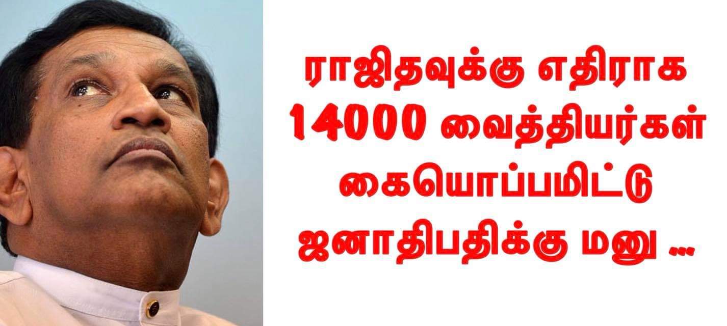 முன்னாள் சுகாதார அமைச்சர் ராஜித சேனாரத்னவுக்கு, மீண்டும் சுகாதார அமைச்சர் பதவியே வழங்கப்படவுள்ளதாக, தகவல்கள் வெளியானதையடுத்து, அதற்கு எதிர்ப்புத் தெரிவித்து, அரசாங்க வைத்திய சங்கத்தின் 14 ஆயிரம் வைத்தியர்கள் கைச்சாத்திட்டு, ஜனாதிபதி மைத்திரிபால சிறிசேனவுக்கு, கடிதமொன்றை கையளித்தாக அந்த சங்கம் அறிவித்துள்ளது.