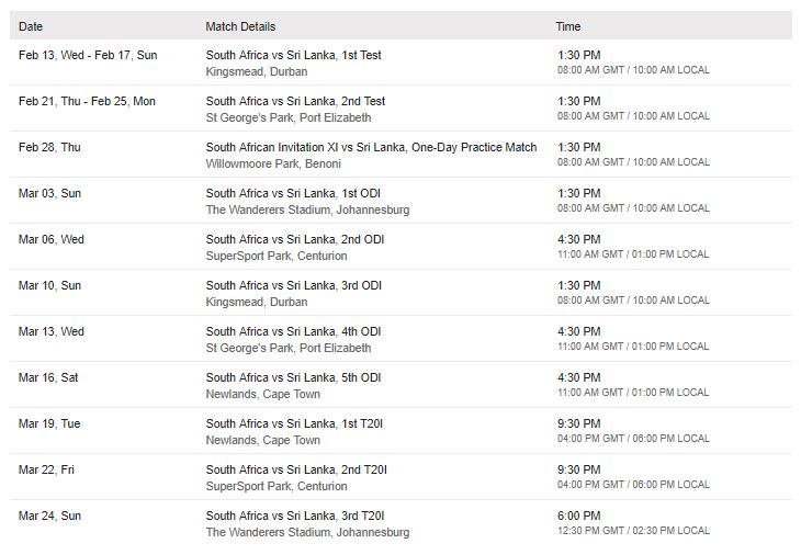இலங்கை கிரிக்கெட் அணியானது தென்னாபிரிக்காவில் சுற்றுலா மேற்கொண்டு விளையாடவுள்ள போட்டிகளின், போட்டிகளுக்கான கால அட்டவணை வெளியிடப்பட்டுள்ளது.