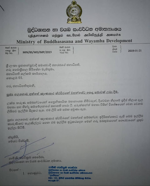 (ஞானசார தேரரின் ஜனாதிபதி பொது மன்னிப்புக்காக, புத்தசாசன அமைச்சர் உத்தியோகபூர்வ வேண்டுகோள்)