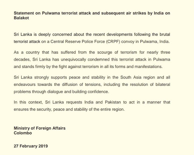 இந்திய புல்வாமா பகுதியில் மத்திய ரிசேர்வ் பொலிஸ் படை பாதுகாப்பு அணி (CRPF) மீது நடாத்தப்பட்ட கொடூரமான பயங்கரவாத தாக்குதலைத் தொடர்ந்து இடம்பெற்றுவரும் சமீபத்திய முரண்பாடுகள் தொடர்பில் இலங்கையானது ஆழ்ந்த கவலையடைகின்றது.