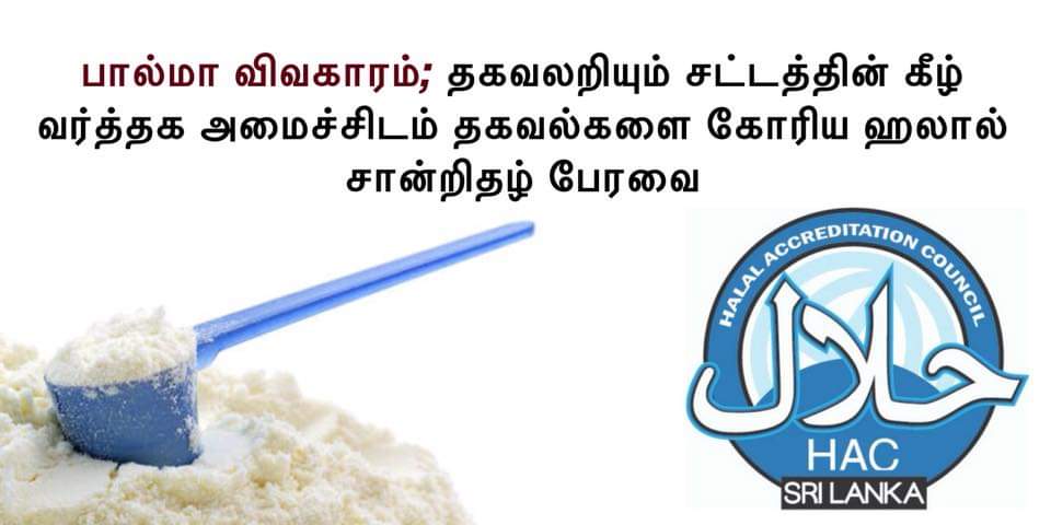 ஹலால் தரச் சான்றிதழினை வழங்கும் ஹலால் சான்றிதழ் பேரவை, இலங்கை கைத்தொழில் மற்றும் வர்த்தக அமைச்சிடம் தகவலறியும் உரிமைச் சட்டத்தின் கீழ் பால்மாக்களின் தரம் தொடர்பான தகவல்களைக் கோரியுள்ளது.