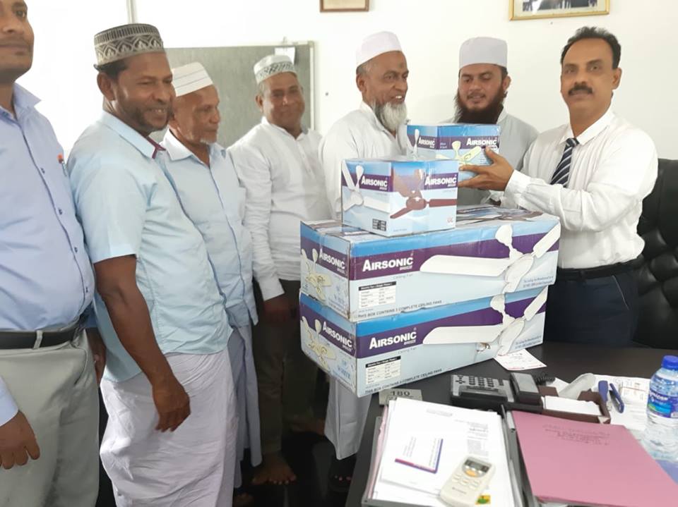 (சாய்ந்தமருது தக்வா ஜும்மா பள்ளிவாசலுக்கு ஒரு தொகை (FAN) களை வழங்கி வைத்தார் கெளரவ. ஏ.சி யஹியாகான்)