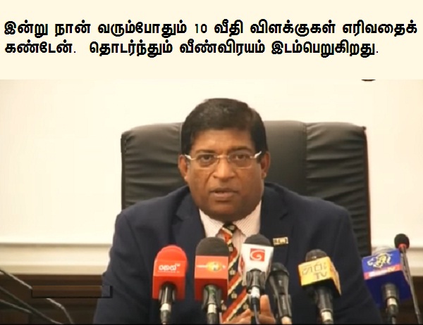இன்று நான் வரும்போதும் 10 வீதி விளக்குகள் எரிவதைக் கண்டேன். ஆகக்குறைந்தது இந்தப் பிரச்சினையை தீர்ப்பதற்கு ஒத்துழைப்பு வழங்க வேண்டும் என்பது தெரிவதில்லை. அதேபோன்று வெசாக் பண்டிகைக்கும் பிரச்சினை இல்லை. முன்னைய வருடங்களை விட அதிக வெசாக் தோரணங்களை அமைக்க முடியும். தொடர்ந்து நாம் மின்சாரத்தை வழங்குவோம். ஒருபோதும் மின்கட்டணத்தை அதிகரிக்க இடமளிக்க மாட்டோம்