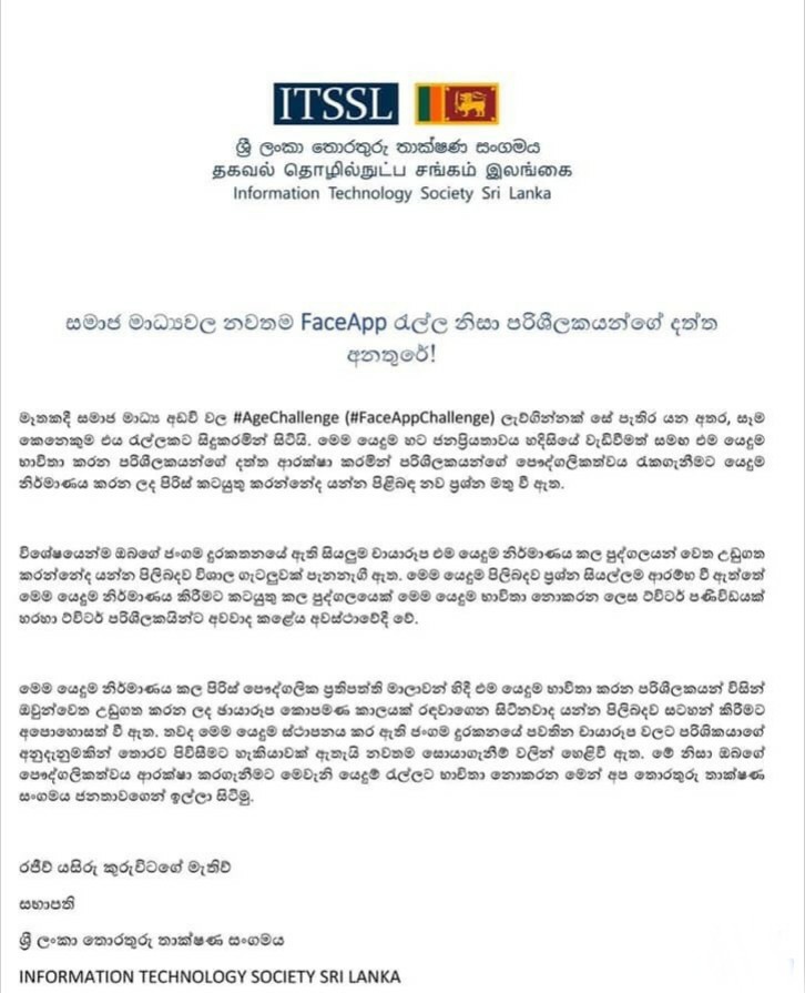 சமூக இணையத்தளங்களில் புதிதாக உருவாக்கப்பட்டுள்ள FaceApp என்ற செயலி மோகத்தின் காரணமாக அதனை பயன்படுத்துவோரின் தரவுகள் காணாமல் ஆக்கப்படுவதாக தகவல் தொழில்நுட்ப சங்கம் தெரிவித்துள்ளது.