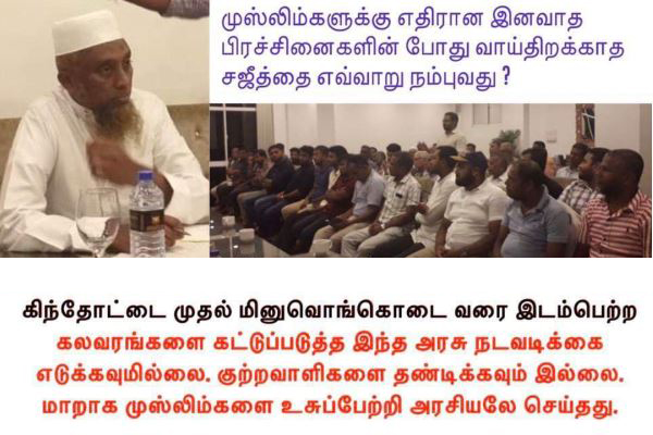 (“முஸ்லிம்களுக்கு எதிரான இனவாத பிரச்சினைகளின்போது வாய்திறக்காத சஜீத்தை எவ்வாறு நம்புவது ?”)