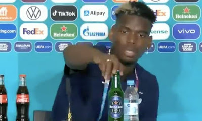 அதைத் தொடர்ந்து செவ்வாய்க்கிழமை இரவு ஜேர்மனிக்கு எதிரான பிரான்சின் தொடக்க ஆட்ட வெற்றியைத் தொடர்ந்து ஊடகக் சந்திப்பினை மேற்கொண்ட பிரெஞ்சு வீரரான பால் போக்பா, தனக்கு முன்னால் மேசையிலிருந்த ஹெய்னெக்கென் பீர் போத்தலை அகற்றினார்.