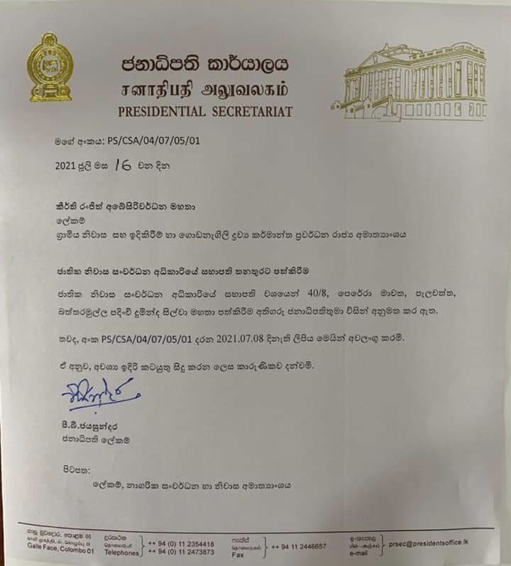 பிரதமர் மகிந்த ராஜபக்சவின் கீழ் உள்ள வீடமைப்பு அமைச்சின் கீழ் வரும் தேசிய வீடமைப்பு அபிவிருத்தி அதிகார சபையின் தலைவராக நியமிக்கப்பட்டுள்ளார்.