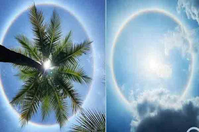 “இதனால் அங்குள்ள நீர் சிறிய பனித்துகளாக மாறி, சூரிய ஒளியை இவ்வாறு திரிபடைய செய்து வெளிப்படுத்துகிறது. அவை சூரியனை சுற்றி வெள்ளை வட்டத்தை ஏற்படுவதனை அவதானிக்க முடியும்” எனத் தெரிவித்துள்ளார். (படங்கள்: சமூக வலைத்தளம்)