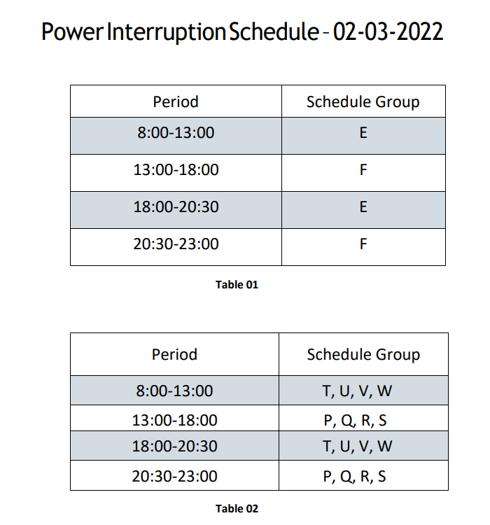 அதன்படி காலை 8.00 மணி முதல் மாலை 6.00 மணிவரை சுழற்சி முறையில் 5 மணிநேர மின்வெட்டும், மாலை 6.00 மணி முதல் இரவு 11.00 மணிவரை 2 1/2 மணிநேர மின்வெட்டும் அமுல்படுத்தப்படவுள்ளது.