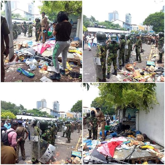இதன் பின்னர் காலிமுகத்திடல் பகுதியில் அமைந்துள்ள கோட்டா கோ கம பகுதிக்கு விரைந்த அரச ஆதரவாளர்கள் வன்முறைகளை கட்டவிழ்த்து விட்டதுடன் கலக செயல்களில் ஈடுபட்டுவருவதுடன், காலி முகத்திடலில் அரச எதிர்ப்பு ஆர்ப்பாட்டக்காரர்களினால் அமைக்கப்பட்டுள்ள கூடாரங்களை தகர்த்தெறிந்து தீயிட்டு வருகின்றனர்.