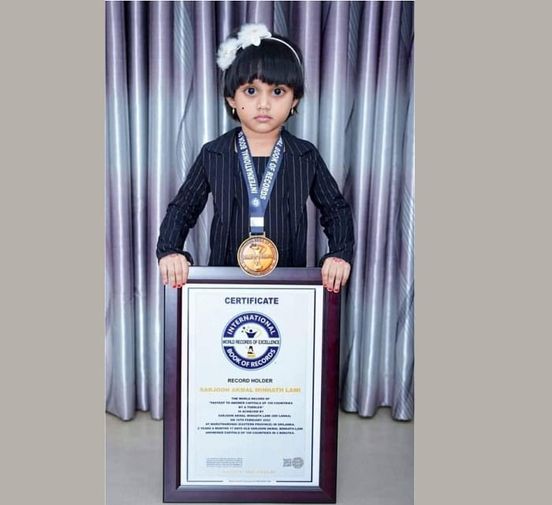 உலக சாதனை புத்தக நிறுவனமானது இச்சிறுமியின் திறமையையும், அதீத நினைவாற்றலையும் பரிசீலனை செய்து உலக சாதனைப் புத்தகத்தில் பதிவு செய்து சாதனைச் சிறுமியாக தமது இணையதளத்தில் வெளியிட்டுள்ளது. இவருக்கான இலச்சினை, பதக்கம், மற்றும் சான்றிதழ் என்பவை அனுப்பி வைக்கப்பட்டுள்ளன.
