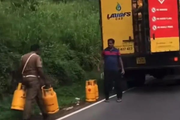 சமையல் எரிவாயு ஏற்றிச் சென்ற வானகத்தை சாலையில் நிறுத்தி பொலிஸ் அதிகாரி ஒருவர் சமையல் எரிவாயுவை பெற்றுக்கொள்வதுபோன்ற காணொளி ஒன்று தற்போது வெளியாகியுள்ளது.