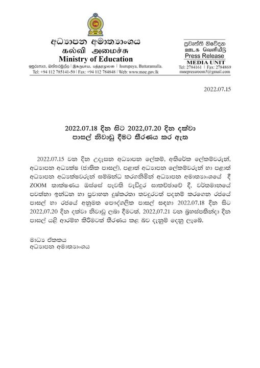 ஜூலை 20ஆம் தேதி வரை பாடசாலைகளுக்கு விடுமுறை அளிக்கப்படும் , புதிய பாடசாலை தவணை 21ஆம் தேதி தொடங்கும். Post navigation அடுத்த 7 நாட்களுக்குள் புதிய ஜனாதிபதி தெரிவு செய்யப்படுவார் – பாராளுமன்றம் நாளை சனிக்கிழமை கூட்டப்படும் – சபாநாயகர் நாட்டை விட்டு வெளியேற சிங்கப்பூர் அரசாங்கம் கோட்டாபயவுக்கு அறிவிப்பு – இன்றும் அங்கு எதிர்ப்பு ஆர்ப்பாட்டம்