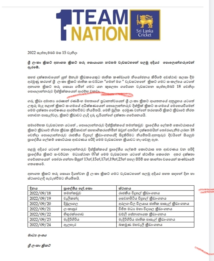 இலங்கையின் தேசிய அணியில் திறமைகளை கொண்ட புதிய வீரர்களுக்கு வாய்ப்பினை பெற்றுக்கொடுக்கும் செயல் திட்டம் ஒன்றினையே இலங்கை கிரிக்கெட் சபை ஏற்பாடு செய்துள்ளது.