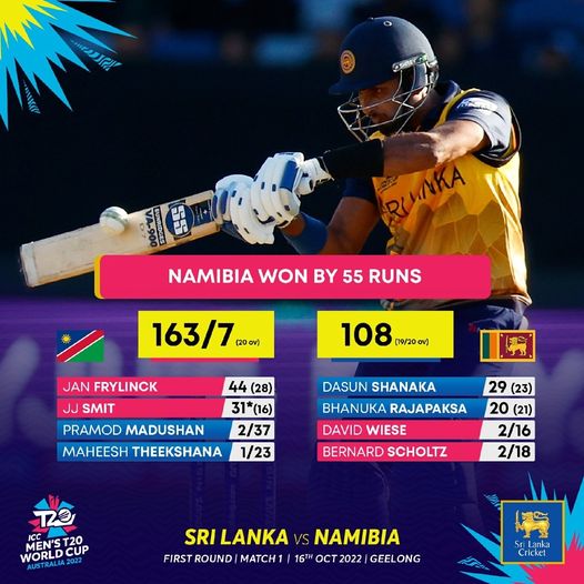 இருபதுக்கு 20 உலகக் கிண்ணத் தொடரின் இன்று இடம்பெற்ற போட்டியில் இலங்கை அணியை வீழ்த்தி 55 ஓட்டங்களால் நமீபியா அணி வெற்றிப் பெற்றுள்ளது.