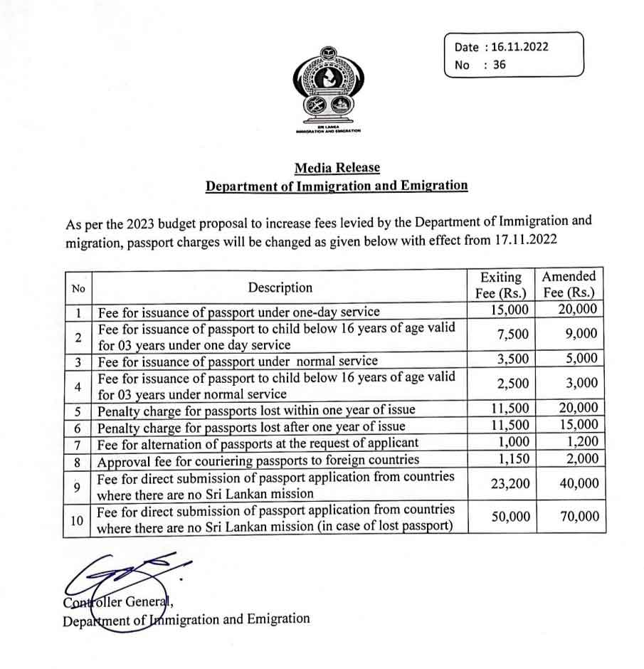 மேலும், சாதாரண சேவை கட்டணத்தை 3,500 ரூபாவில் இருந்து 5 ஆயிரமாக அதிகரிக்க குடிவரவு குடியகல்வுத் திணைக்களம் தீர்மானித்துள்ளது.
