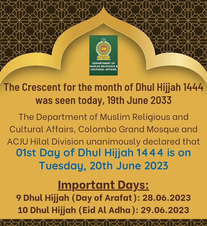 ஜுன் 29 வியாழக்கிழமை இலங்கையில் ஹஜ்ஜுப் பெருநாள் என இன்று அவிறிக்கப்பட்டுள்ளது.
