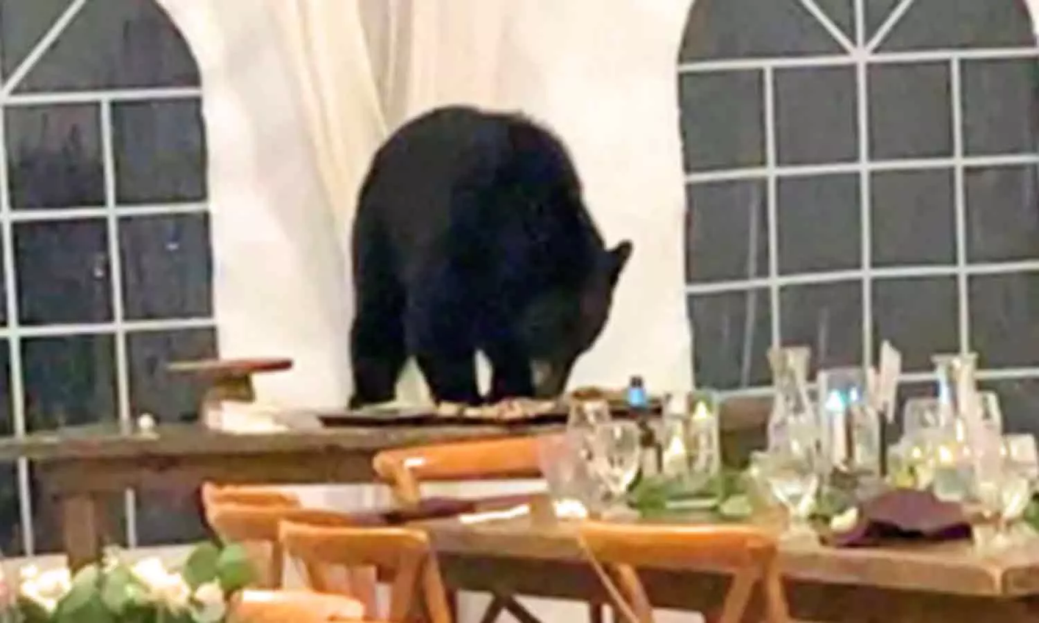 அமெரிக்காவின் கொலராடோ பகுதியில் ஒரு இளம்ஜோடிக்கு சமீபத்தில் திருமணம் நடந்தது. இதையொட்டி வரவேற்பு விழாவும் தடபுடலாக நடைபெற்றது. இந்த விழாவில் பங்கேற்பதற்காக விருந்தினர்கள் திரளாக வந்திருந்தனர். அவர்களுக்காக பல்வேறு இனிப்பு வகைகள் மற்றும் விதவிதமான உணவு பண்டங்கள் தயார் செய்யப்பட்டு மேஜையில் வைக்கப்பட்டிருந்தது. இந்நிலையில் எதிர்பாராதவிதமாக திருமண வரவேற்பு விழா நடைபெறும் இடத்திற்குள் கரடி புகுந்து விட்டது. இதைப்பார்த்த விருந்தினர்கள் அதிர்ச்சி அடைந்தனர். அவர்கள் அங்கும் இங்குமாக ஓடி தப்பிய நிலையில் கரடி நேராக அங்கு மேஜையில் வைக்கப்பட்டிருந்த இனிப்புகள் மற்றும் உணவு பண்டங்களை எடுத்து சாப்பிட்டுள்ளது. பின்னர் பாதுகாப்பு படையினர் அங்கு விரைந்து வந்து கரடியை விரட்டி உள்ளனர். அதிர்ஷ்டவசமாக இந்த சம்பவத்தில் யாருக்கும் காயம் ஏற்படவில்லை. திருமண வரவேற்பு விழாவிற்குள் கரடி புகுந்து இனிப்புகளை சாப்பிட்ட புகைப்படங்கள் பேஸ்புக்கில் வெளியாகி வைரலானது. இதைப்பார்த்த பயனர்கள் தங்களது கருத்துக்களை பதிவிட்டு வருகிறார்கள்.
