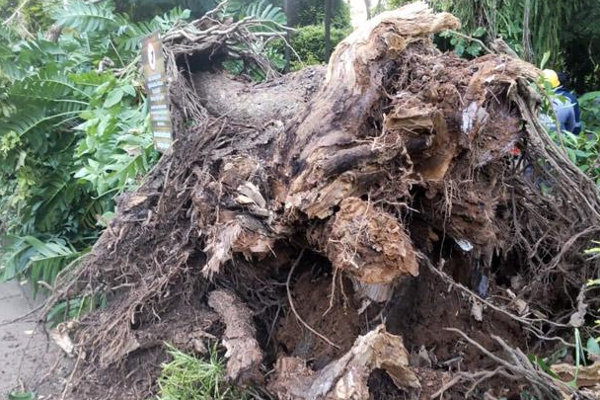 மிருகக்காட்சிசாலையின் பிரதான வீதிக்கு அருகில் உள்ள கால்நடை வைத்தியசாலைக்கு முன்பாக உள்ள பாரிய மரம் வேரோடு சாய்ந்து மின்கம்பிகள் இணைக்கப்பட்டிருந்த கம்பத்தில் மோதியுள்ளது.