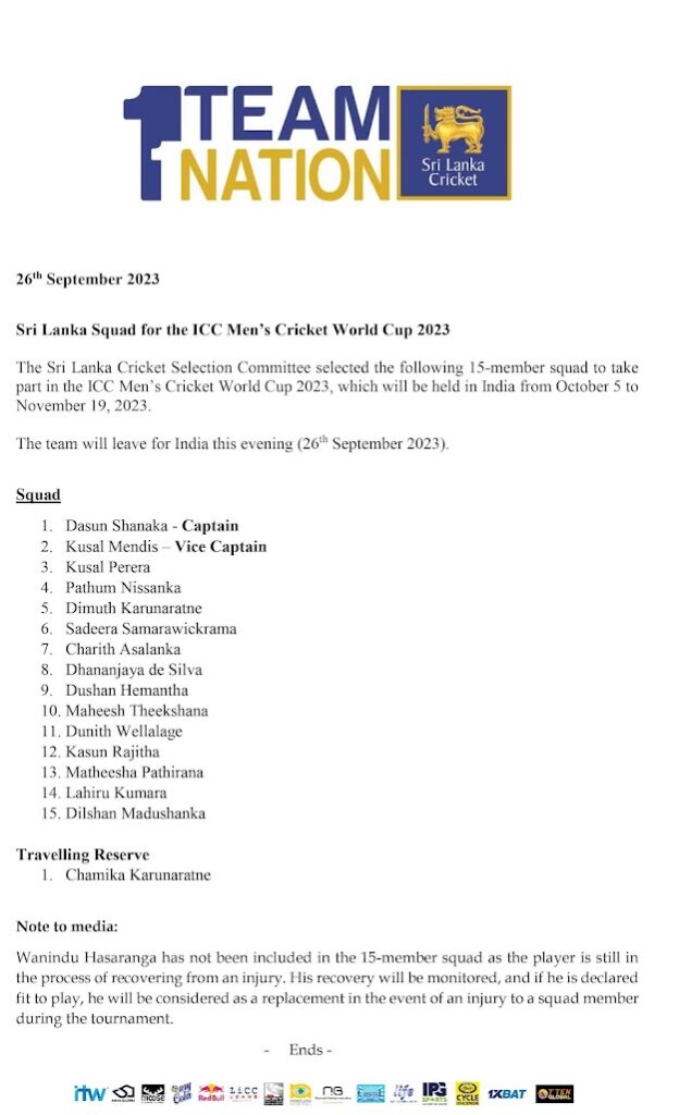 உலகக் கிண்ணத்தில் பங்கேற்கும் இலங்கை கிரிக்கெட் அணி குறித்த உத்தியோகபூர்வ அறிவிப்பு வெளியாகியுள்ளது.