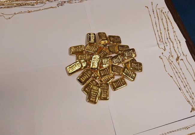 சந்தேகநபர்கள் தங்க பிஸ்கட்டுகளை அவர்களின் உடலிலும், அவர்கள் கொண்டு வந்த கைப்பைகளிலும் மறைத்து வைத்திருந்ததை சுங்க அதிகாரிகள் தெரிவிக்கின்றனர்.