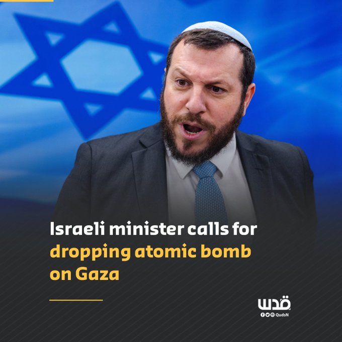 அல்ட்ராநேஷனலிஸ்ட் இஸ்ரேலிய பாரம்பரிய அமைச்சர் அமிச்சாய் எலியாஹு காஸா மீது அணுகுண்டு வீசப்பட வேண்டும் என்று அழைப்பு விடுத்துள்ளார்.