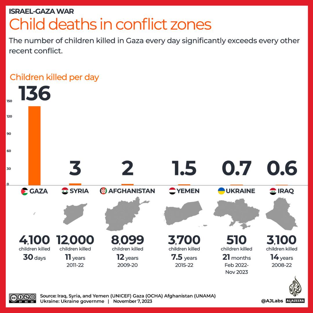 உக்ரைன், ஆப்கானிஸ்தான், ஈராக் மற்றும் பிற மோதல் மண்டலங்களுடன் ஒப்பிடும்போது காஸாவில் தினமும் பல குழந்தைகள் கொல்லப்படுகின்றனர்.