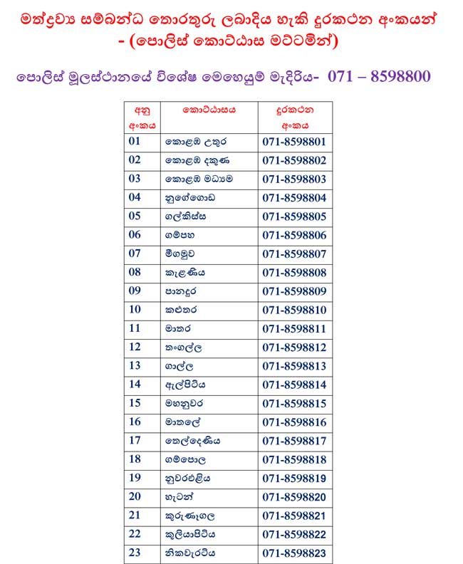 இந்த தொலைபேசி இலக்கங்கள் ஒவ்வொரு பொலிஸ் பிரிவுகளுக்கும் என வேறுபடும்.