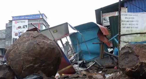மண் மேடு சரிந்து விழுந்ததில், அருகில் இருந்த இரண்டு சிறிய கடைகள் முற்றாக சேதமடைந்துள்ள நிலையில், கடையில் இருந்த இரண்டு வியாபாரிகள் அதிஷ்டவசமாக உயிர் தப்பியுள்ளனர்.