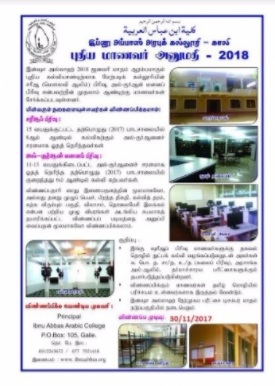 இலங்கையின் தென் மாகாணத்தில் அமையப்பெற்றுள்ள காலி இப்னு அப்பாஸ் அரபுக் கல்லூரியில் இன்ஷா அல்லாஹ் 2018 ஆண்டு ஜனவரி மாதம் ஆரம்பமாகும் புதிய கல்வியாண்டிற்கான மேற்படிக் கல்லூரியின் சரீஆ (மௌலவி ஆலிம்) பிரிவு, அல்குர்ஆன் மனனப் பிரிவு என்பவற்றின் முதலாம் ஆண்டிற்கு புதிதாக மாணவர்கள் சேர்க்கப்படவுள்ளதாக காலி இப்னு அப்பாஸ் அரபுக் கல்லூரியின் அதிபர் அஷ்ஷேய்க் டப்ளியூ.தீனுல் ஹஸன் (பஹ்ஜி) தெரிவித்தார்.
