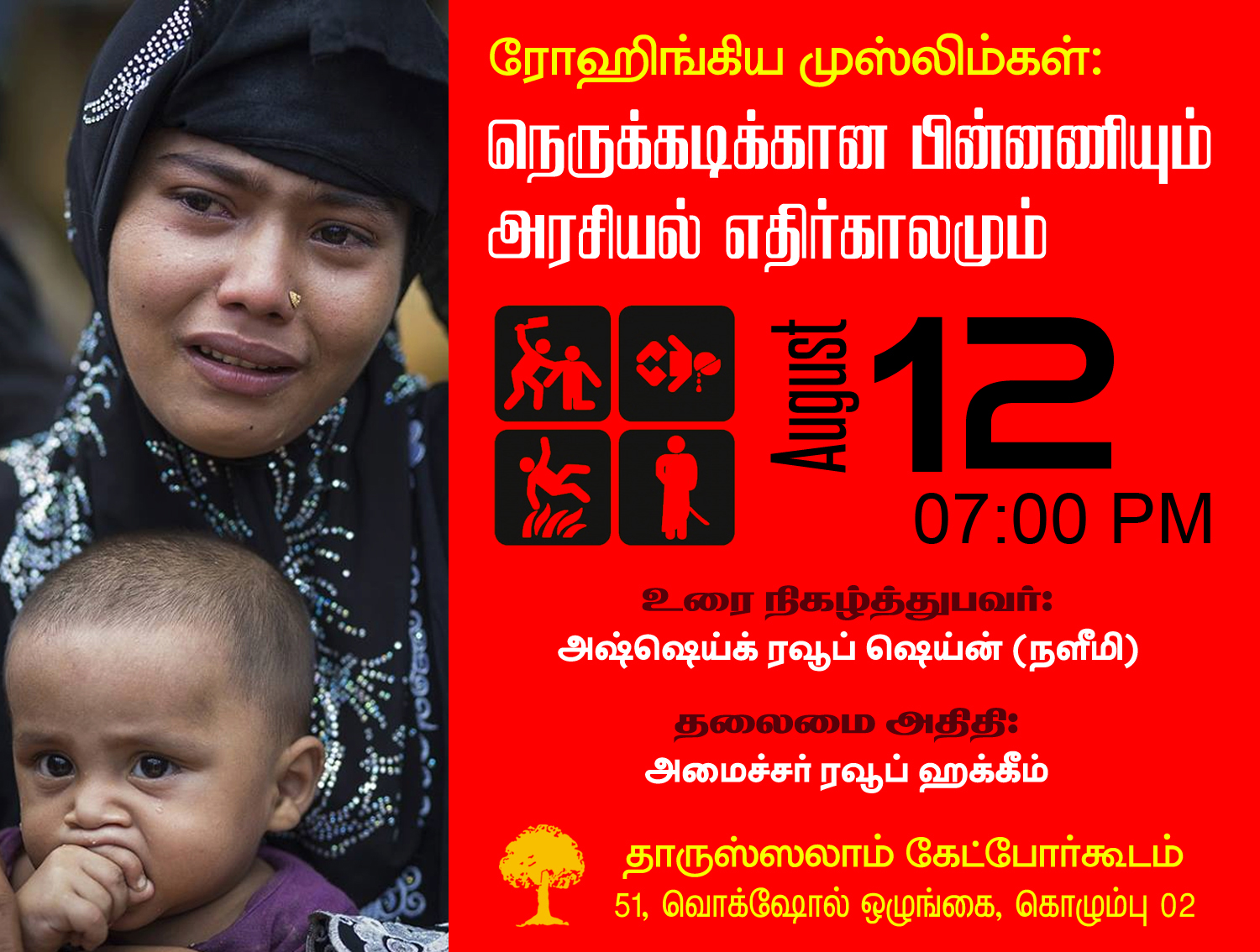 ~ரோஹிங்கிய முஸ்லிம்கள்: நெருக்கடிக்கான பின்னணியும் அரசியல் எதிர்காலமும்| எனும் தலைப்பில் அஷ்ஷெய்க் ரவூப் ஷெய்ன் இந்த விசேட சொற்பொழிவை நிகழ்த்தவுள்ளார்.