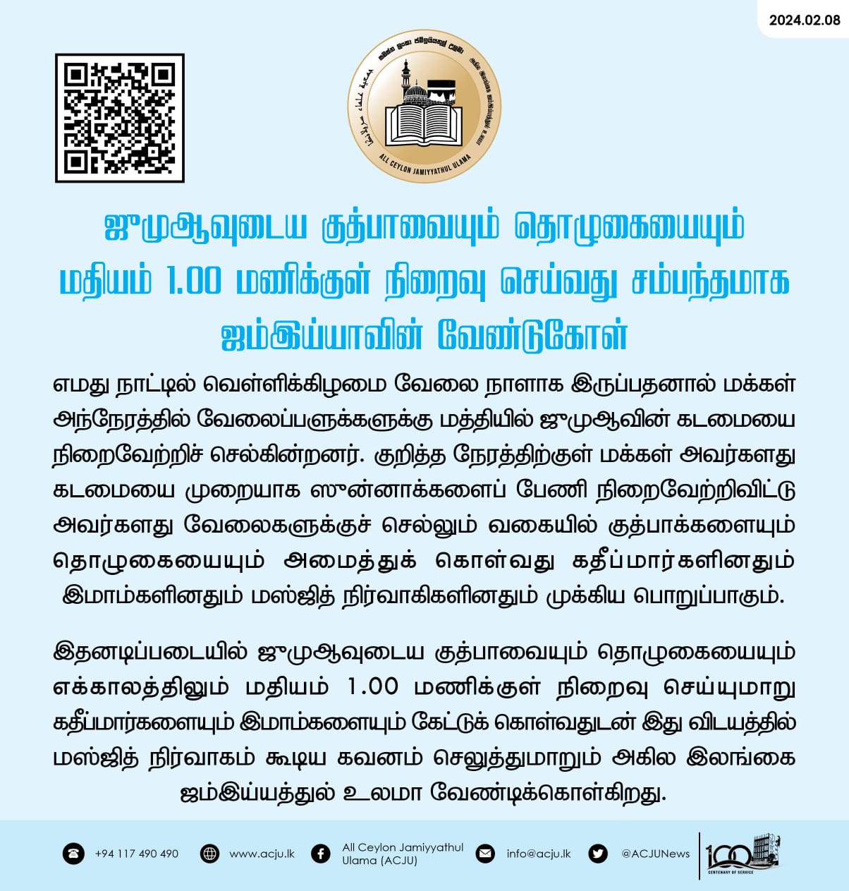 ஜுமுஆவுடைய குத்பாவையும் தொழுகையையும் மதியம் 1.00 மணிக்குள் நிறைவு செய்வது சம்பந்தமாக. Post navigation இன்று டொலர், அரபு, ரூபாய் கரன்சிகளின் நிலவரம் 19 வயதுடைய இளைஞன் பலியான விதம்!