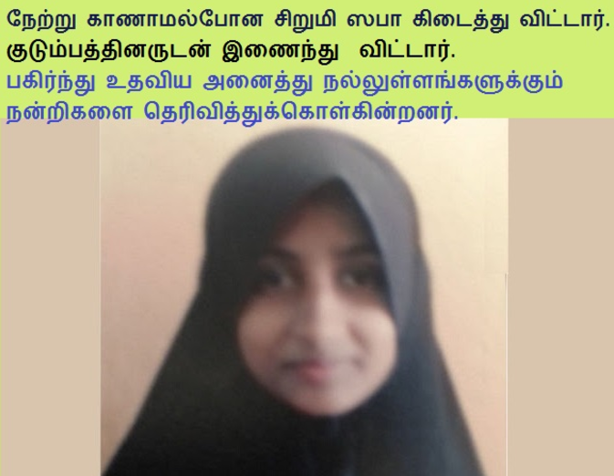 நேற்று காணாமல்போன சிறுமி ஸபா நேற்று பின்னிரவு கிடைத்து விட்டதாகவும் . குடும்பத்தினருடன் இணைந்து விட்டார் எனவும். அவர் கல்வி கற்கும் வெள்ளம்பிடிய மதரசாவுக்கே அவர் வந்து சேர்ந்ததாகவும் குடும்பத்தினர் எம்மிடம் தெரிவித்தனர்.