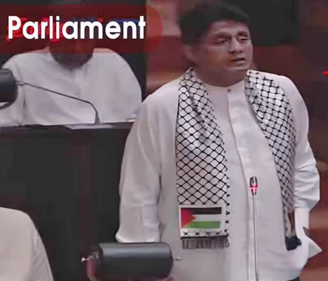 ஐக்கிய மக்கள் சக்தியின் தலைவரும் எதிர்க்கட்சித் தலைவருமான சஜித் பிரேமதாஸ, பாராளுமன்றத்தில் தற்போது உரையாற்றிக்கொண்டிருக்கின்றார். அவர் பலஸ்தீன கொடி மற்றும் இலங்கையின் தேசிய கொடி ஆகிய இரண்டு கொடிகளும் பொறிக்கப்பட்ட சால்வை அணிந்துள்ளார்.