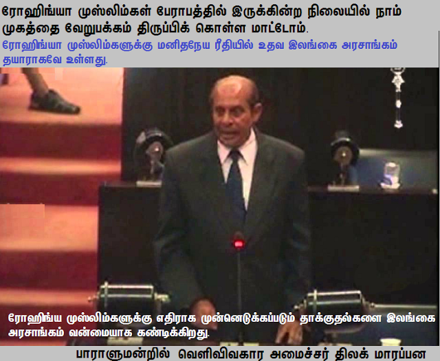 அவர் மேலும் தெரிவிக்கையில், மியன்மாரில் ரோஹிங்ய முஸ்லிம்களுக்கு எதிராக முன்னெடுக்கப்படும் தாக்குதல்களை இலங்கை அரசாங்கம் வன்மையாக கண்டிக்கிறது.