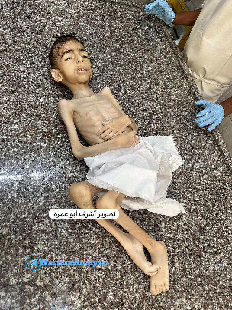 மத்திய காசாவில் உள்ள டெய்ர் அல்-பாலாவில் உள்ள அல்-அக்ஸா தியாகிகள் மருத்துவமனையில். கட்டாயப் பஞ்சப் போரால் ஏற்பட்ட ஊட்டச்சத்து குறைபாடு காரணமாக அவர் இறந்துள்ளார்.