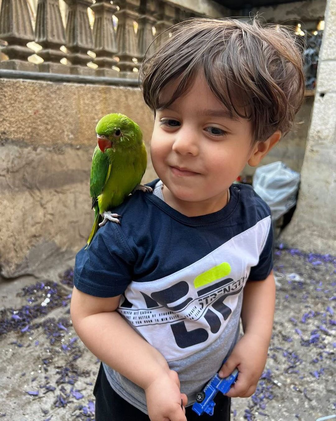 தனது பறவை மற்றும் கையில் சிறிய பிளாஸ்டிக் காருடன், முகத்தில் புன்னகையுடன் விளையாடுவதை புகைப்படம் காட்டுகிறது.
