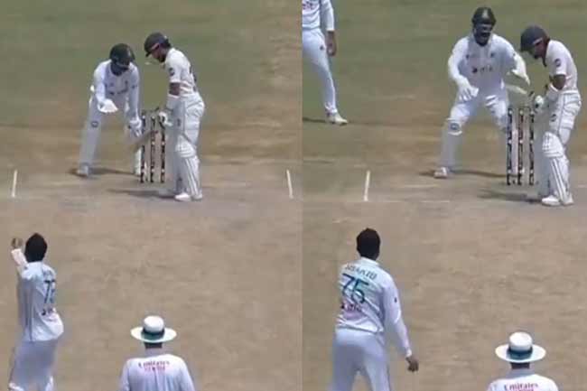 பாகிஸ்தானுக்கு எதிரான டெஸ்ட் போட்டியில் பந்து வீசுவதும் போது துடுப்பாட்ட வீரர் தயாராகவில்லை என்ற கோவத்தில் முகமது ரிஸ்வானின் தலைக்கு நேராக பந்தை எறிந்தார் ஷகிப் ஹல் ஹசன்.