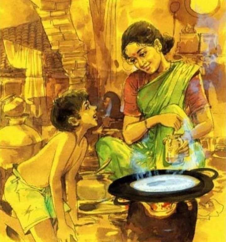 பெரியம்மாவோ, அத்தையோ தட்டை கழுவி அதில் சோற்றைப் போட்டு குழம்பை ஊற்றிக் கொடுக்க வேண்டும். அவன்கள் சாப்பிடும் வரை காத்திருக்க வேண்டும்.