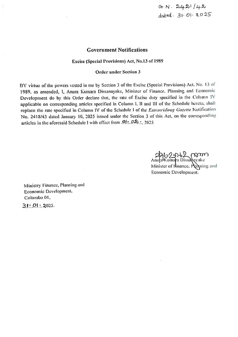மின்சார வாகனங்களை இறக்குமதி செய்யும் போது கொள்ளளவைப் பொறுத்து விதிக்கப்படும் வரிகள் குறித்து அறிவிக்கும் அதிவிசேட வர்த்தமானி அறிவித்தல் ஒன்று வெளியிடப்பட்டுள்ளது.
