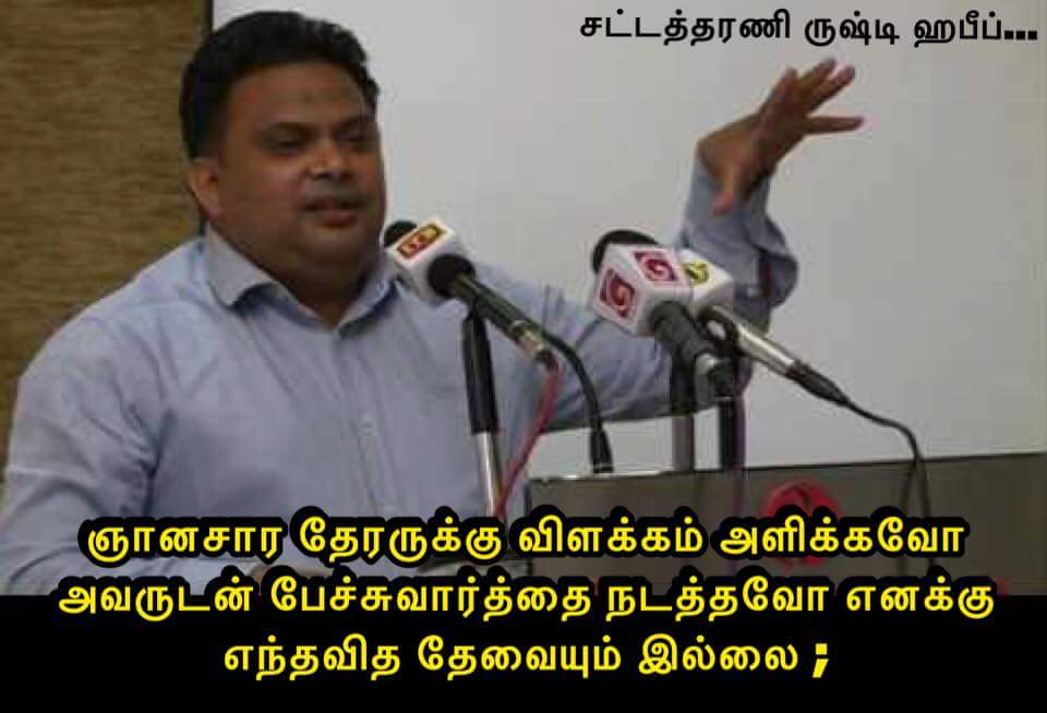 இந்த நிலையிலே ஞானசார தேரருக்கு விளக்கம் அளிக்கவோஅவருடன் பேச்ச்சுவார்த்தை நடத்தவோ தனக்கு எந்தவிததேவையும் இல்லை என சிரேஷ்ட சட்டத்தரணி ருஸ்தி ஹபீப்மடவளை நியுசுக்கு குறிப்பிட்டார்.