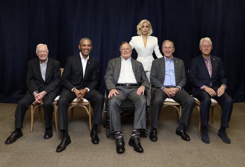இந்த நிலையில், அங்கு டெக்சாஸ் மாகாணத்தில் நடந்த இசை நிகழ்ச்சியில் அமெரிக்காவின் முன்னாள் ஜனாதிபதிகளான ஒபாமா, ஜார்ஜ் டபிள்யு புஷ், பில் கிளிண்டன், ஜார்ஜ் எச்.டபிள்யு. புஷ், ஜிம்மி கார்ட்டர் ஆகிய 5 பேரும் மேடையில் ஒன்றாக தோன்றினர். அப்போது தேசிய கீதம் இசைக்கப்பட்டது. இவர்களில் ஜார்ஜ் டபிள்யு புஷ், ஜார்ஜ் எச்.டபிள்யு. புஷ் ஆகிய இருவரும் குடியரசு கட்சியினர். மற்ற 3 பேரும் ஜனநாயக கட்சியினர். பொது நலனுக்காக அவர்கள் கட்சி வேறுபாடுகளுக்கு அப்பால் ஒன்று சேர்ந்தது மக்களை கவர்ந்தது.