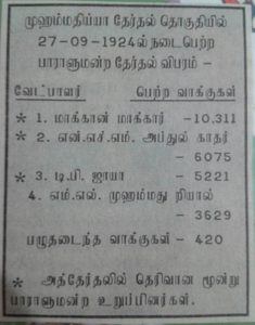 1924.09.27 ல் அன்றைய சிலோன் (ceylon) இல் நடைபெற்ற முகம்மதிய்யா தேர்தல் தொகுதி சட்டசபைத் தேர்தல் Post navigation சரதியலும், மரிக்காரும்; ஒரு ”கொமா”வினால் கொல்லப்பட்ட மாவனெல்ல வீரர்கள் சிறிகொத்தவுக்கு காணி வழங்கிய Dr.M.C அப்துல் ரகுமான்