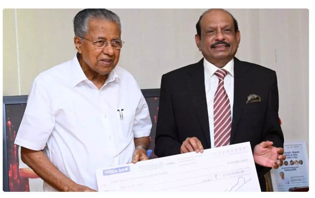 லூலூ குரூப் சேர்மன் எம்.ஏ.யூசுப் அலி தனது பங்களிப்பாக பத்து கோடி ரூபாய்க்கான செக் கேரள முதல்வர் பிணராய் விஜயனை இன்று (20) நேரில் சந்தித்து வழங்கினார்.