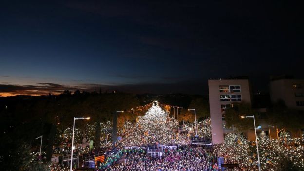 மத்திய அரசைக் கண்டித்தும், கைது செய்யப்பட்ட கேட்டலன் தலைவர்களை விடுவிக்கக் கோரியும் சனிக்கிழமையன்று பார்சிலோனாவில் நடைபெற்ற பிரம்மாண்ட பேரணியில், செல்போன் டார்ச் லைட்களை அடித்தவாறு வீதிகளில் மக்கள் நடந்து சென்றனர்.