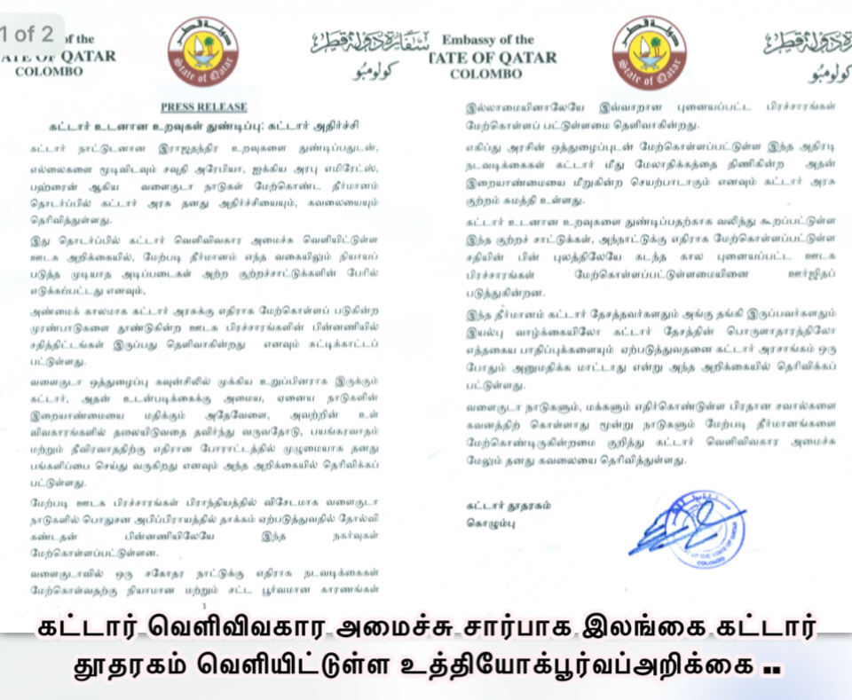 இது தொடர்ப்பில் கட்டார் வெளிவிவகார அமைச்சு வெளியிட்டுள்ள ஊடக அறிக்கையில், மேற்படி தீர்மானம் எந்த வகையிலும் நியாயப் படுத்த முடியாத அடிப்படைகள் அற்ற குற்றச்சாட்டுக்களின் பேரில் எடுக்கப்பட்டது எனவும்,