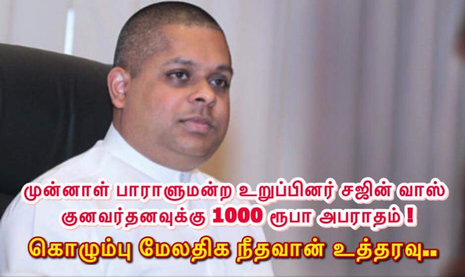 முன்னாள் பாராளுமன்ற உறுப்பினர் சஜின்வாஸ் குணவர்த்தனவுக்கு 1000 ரூபாய் அபராதம் விதித்து கொழும்பு மேலதிக நீதவான் உத்தரவு பிறப்பித்துள்ளார்.