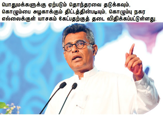 யாசகம் கேட்பவர்களால் தொந்தரவு ஏற்படுகிறது எனவும், அதைத் கருத்திற்கொண்டும், கொழும்பை அழகாக்கும் திட்டத்தின்படியும், கொழும்பு நகர எல்லைக்குள் யாசகம் கேட்பதற்குத் தடை விதிக்கப்பட்டுள்ளது என, அவர் குறிப்பிட்டார்.